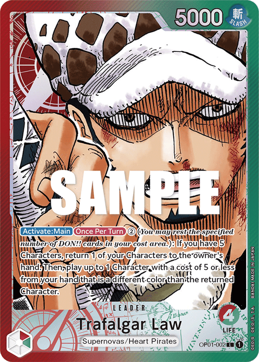 Trafalgar Law (OP01-002): Law’s leader (red/green dual-color) was the first dual-color leader many players experienced. To this day, OP01 Law is remembered as one of the game’s best-designed leaders and a fan-favorite to play. |