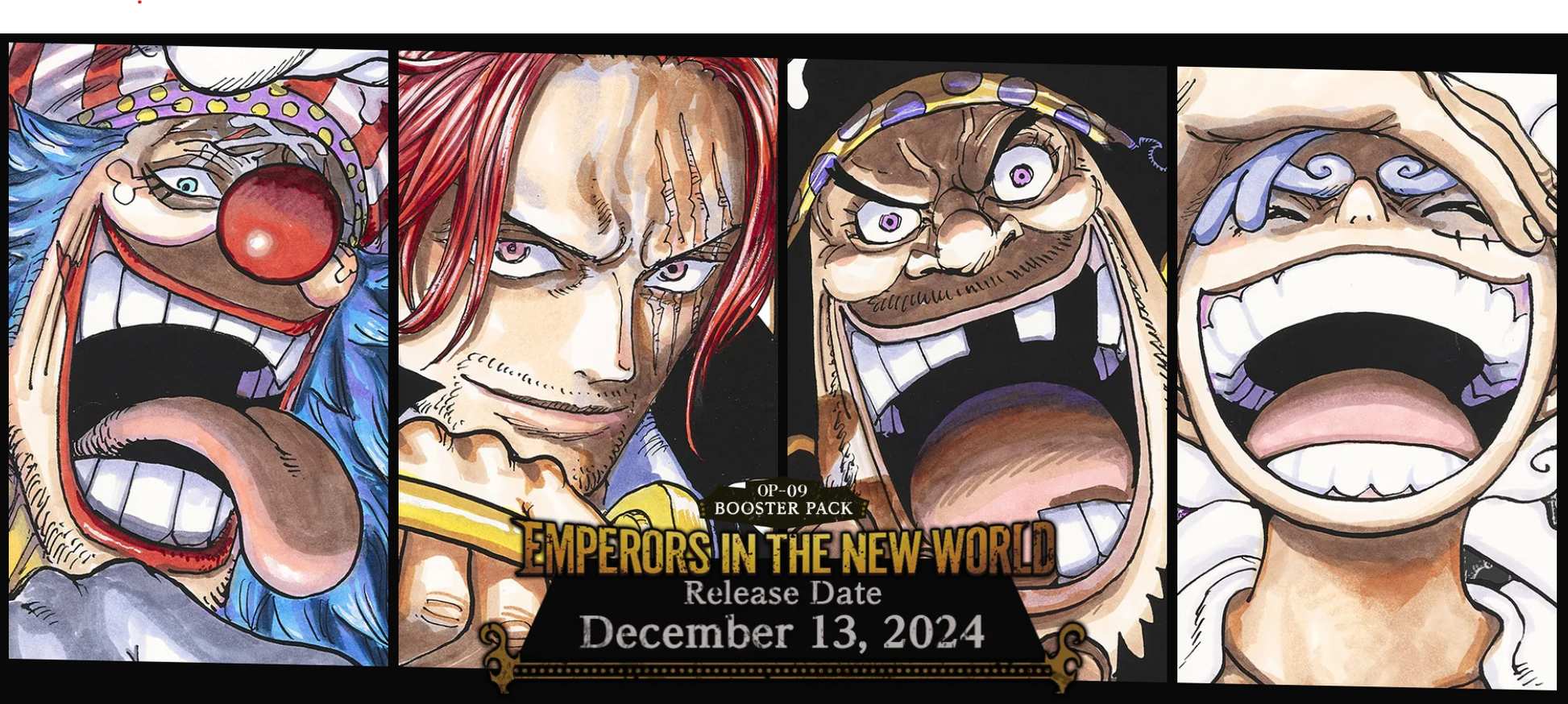 Emperors of the New World (OP09) released on December 13, 2024. This second-anniversary set puts the spotlight on the Four Emperors of the New World: Luffy, Buggy, Blackbeard, and Shanks.
